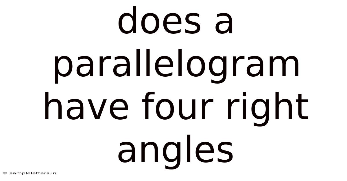 The question "Does a parallelogram have four right angles?" is a deceptively simple one. While all rectangles are parallelograms, the converse is not always true. A parallelogram only possesses four right angles when it conforms to the specific angular constraint that defines a rectangle. And through practical measurement, algebraic representation, and an understanding of parallelism, we can definitively determine whether a given figure qualifies as a rectangle. From the structures we build to the devices we use, the rectangle’s prevalence underscores its fundamental importance in mathematics, science, and the world around us. Recognizing and understanding its unique properties allows us to appreciate its role in shaping our environment and expanding our understanding of geometric principles Most people skip this — try not to..