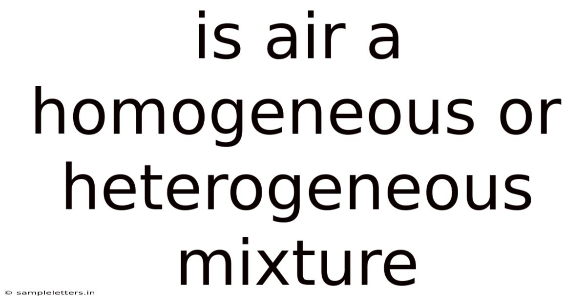 Air is a fundamental componentof Earth’s atmosphere, and its classification as a homogeneous or heterogeneous mixture has been a topic of scientific discussion. A homogeneous mixture is a combination of two or more substances that are uniformly distributed throughout, making it impossible to distinguish the individual components without specialized tools. It matters. On the flip side, to determine whether air is homogeneous or heterogeneous, Make sure you understand the definitions of these terms and analyze the composition of air. In practice, in contrast, a heterogeneous mixture contains visibly distinct parts, where the components can be separated by physical means. The question of whether air is homogeneous or heterogeneous hinges on its molecular structure, the distribution of its components, and the conditions under which it exists That's the part that actually makes a difference..